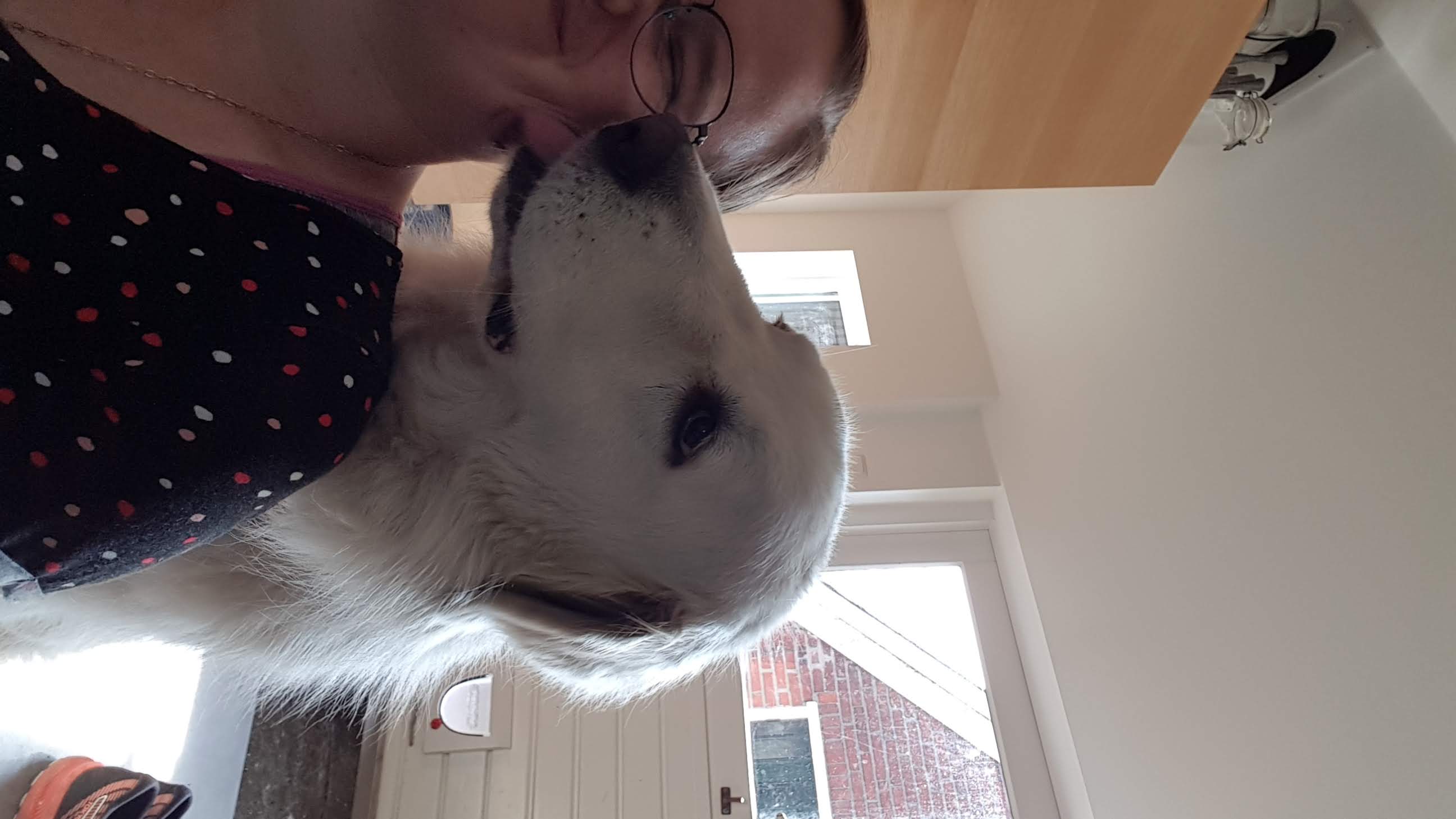 This is such a beautiful moment. After my dog eats his dinner, he always runs over to me and puts his head on my face and gives me loves and kisses. I believe it's his way of saying thank you for the food. This pic reminds me of that.