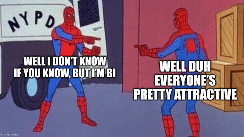 I came out to my best friend and said “well I don’t know if you know, but I’m bi” and she came out at the same time by saying “well duh everyone’s pretty attractive” and honestly I was so so stoked, it was like the Spider-Man meme.
