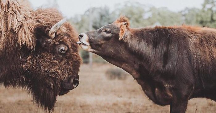 This is Helen, a blind bison that has spent years at Oregon’s Lighthouse Farm Sanctuary without making a single friend. She was nervous, suspicious and seemingly destined to live out the rest of her life sad and alone. But then came Oliver. The young Jersey calf was curious from birth and soon managed to break down the barriers that Helen had constructed around herself. She came to trust him, and they became firm friends.