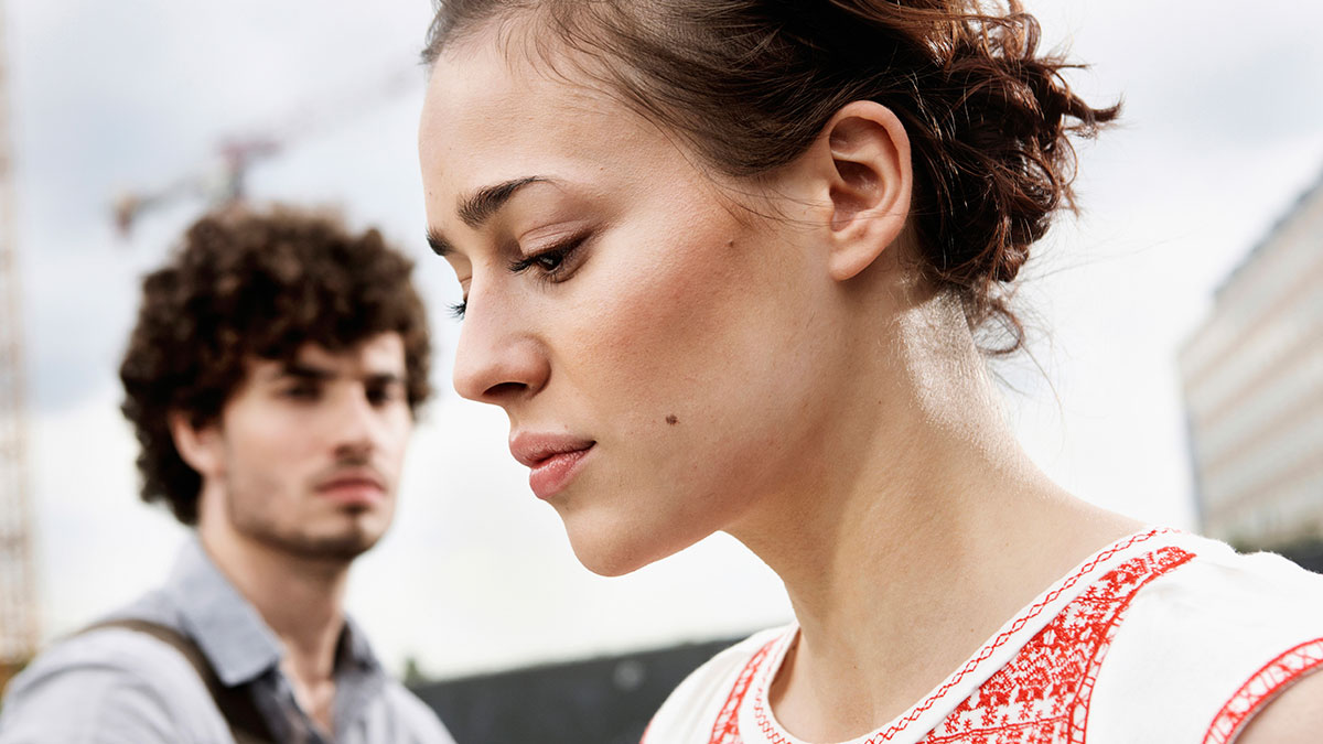 Young woman looking upset in foreground with young man in background, highlighting tensions in maid of honor duties at wedding.