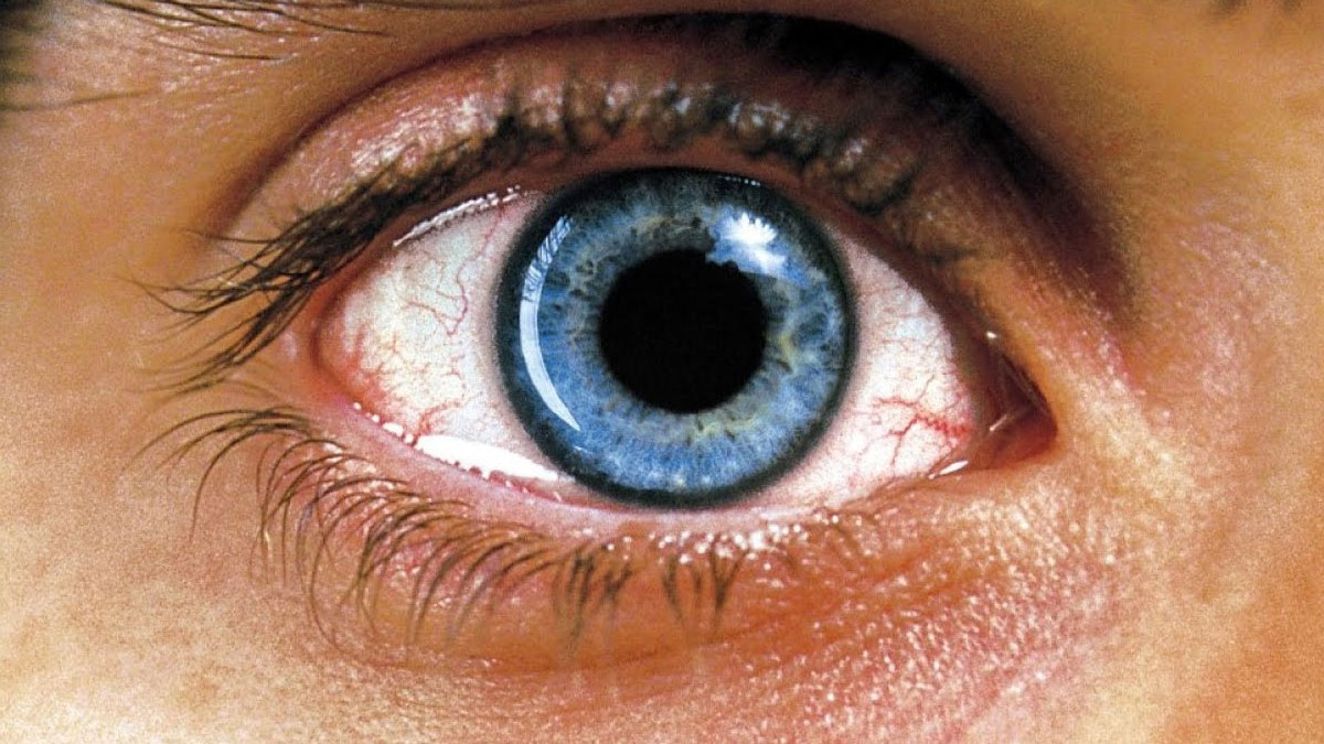 Poster of "Requiem for a Dream" featuring a close-up eye and a person in red on a pier, highlighting unforgettable movies. Requiem for a Dream—brilliantly made but absolutely devastating.