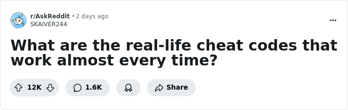 "Lately, I’ve been down the rabbit hole of real-life cheat codes on YouTube, and a bunch of them actually worked. I figured the Reddit community would have some great ones to share, so I posted the question out of curiosity."