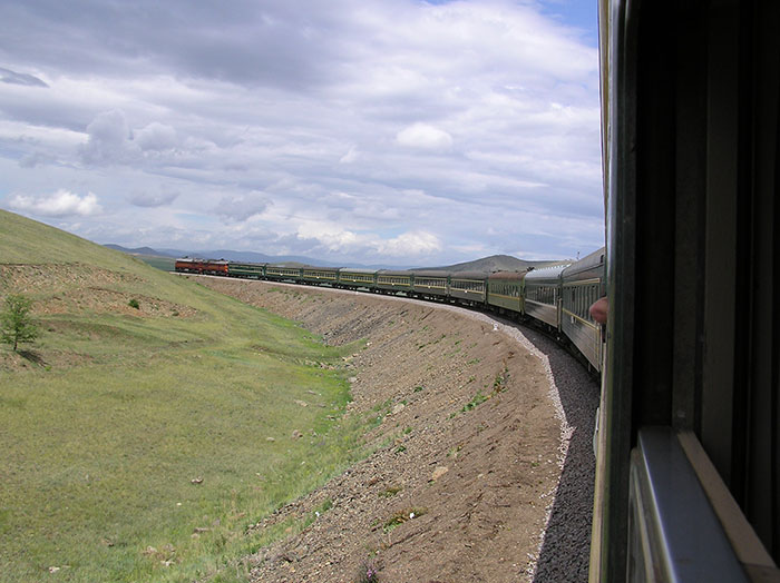 The Trans-Mongolian route has quite a lot of views to offer us. The landscape changes to barren red plains with grassy dunes descending across the horizon as the train travels from Russia into Mongolia. You can see the glimmer of rivers and lakes bending toward the tracks in the twilight.