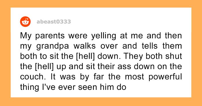 My parents were yelling at me and then my grandpa walks over and tells them both to sit the [hell] down. They both shut the [hell] up and sit their ass down on the couch. It was by far the most powerful thing I've ever seen him do lmao.