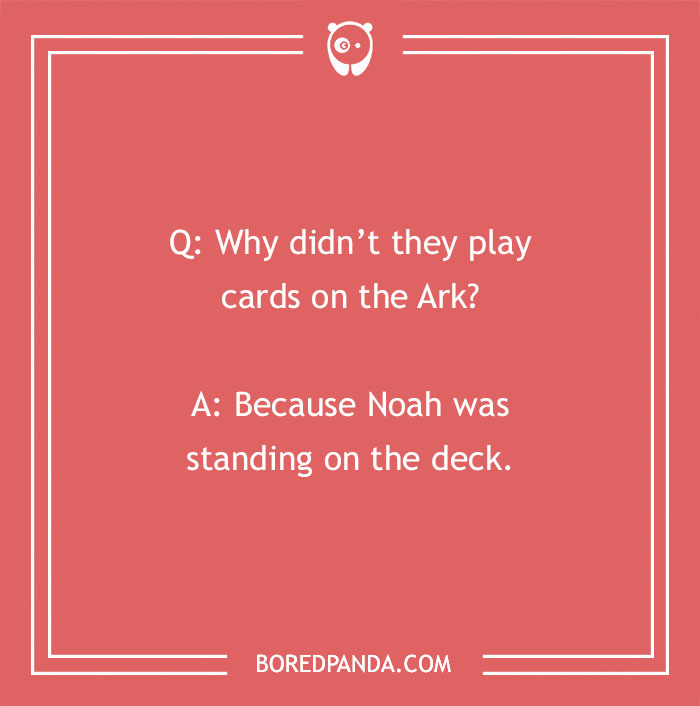 Well then, are you truly ready to find out who put the Ha- in Hallelujah? Prepared to accept the fun into your day? If so, scroll down below and check out our funny Bible jokes! Besides, there are also some pretty cool Bible jokes for kids here, which might give you an hour of respite if you’re taking care of a flock of little ones.