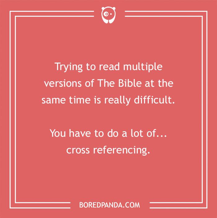 Trying to read multiple versions of The Bible at the same time is really difficult.