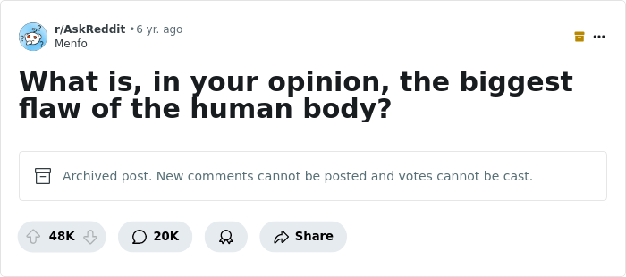 Load More Replies...Humans aren't the hardiest animals out there, but at least we have big brains that can figure out solutions to many of these things. I don't think we were meant to live much past childbearing/raising age so our parts wearing out or malfunctioning is just natural. Doesn't make it suck any less, though!