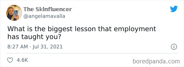 Several months ago, Twitter user angelamavalla asked her followers, "What is the biggest lesson that employment has taught you?" and hundreds of answers started rolling in. So take a look at some of the best tweets Bored Panda has collected from this thread, upvote the ones you agree with, and be sure to share your own thoughts in the comment section below!
