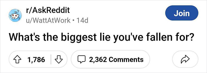 Redditor ‘WattAtWork’ has recently started a discussion about lies among members of the ‘Ask Reddit’ community. They asked them what has been the biggest lie they’ve ever fallen for, and fellow netizens shared all sorts of stories, ranging from funny to pretty upsetting, and everything in between. If you want to see what kind of webs netizens have found themselves trapped in, scroll down to find their answers on the list below to find out.
