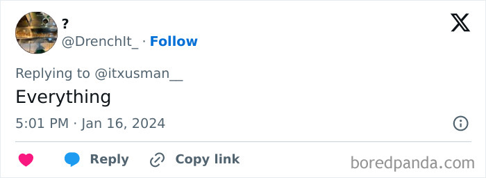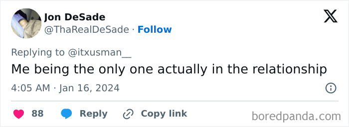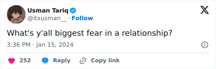 X user Usman Tariq asked internet users “What's y'all biggest fear in a relationship?” and people shared their thoughts, from dealbreakers to worst-case scenarios. So get comfortable as you scroll through, upvote your favorite posts, and be sure to share your thoughts in the comments below.