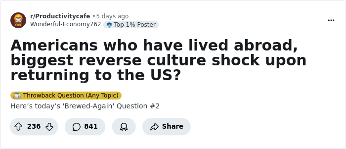 They may also find themselves shocked at the customs of their home country when they return, much like what these American expats went through. They shared their experiences in a recent Reddit thread, revealing how much they no longer recognize their own culture.