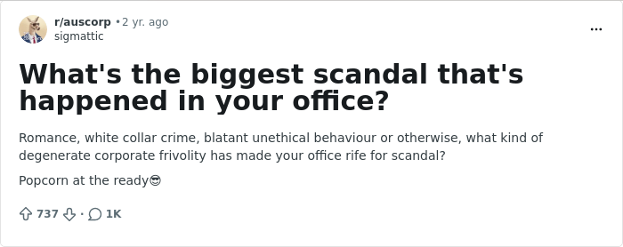 There's a post on the subreddit r/AusCorp — a place where members of corporate Australia come together to discuss and gossip about their roles and industries — that has everyone sharing the biggest scandals to have shaken their offices.