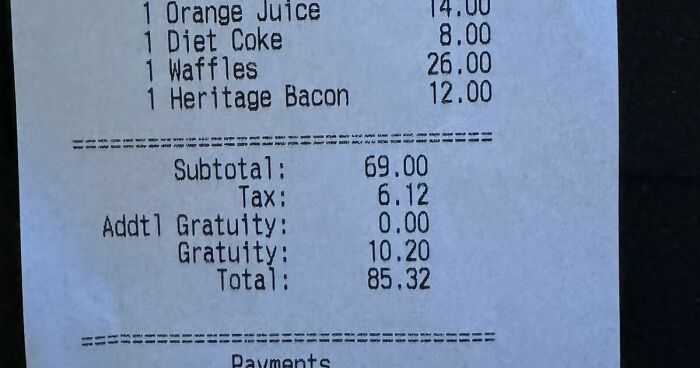 I could understand say the waffles being more expensive. Maybe they're hand prepared not just store bought and heated up. But $14 for a glass of OJ? And $8 for a diet coke? I don't normally have sympathy for billionaires but I agree with him on that. He's already paying a service fee (it's on the bill), in fact there are two. The In room dining charge and the gratuity.