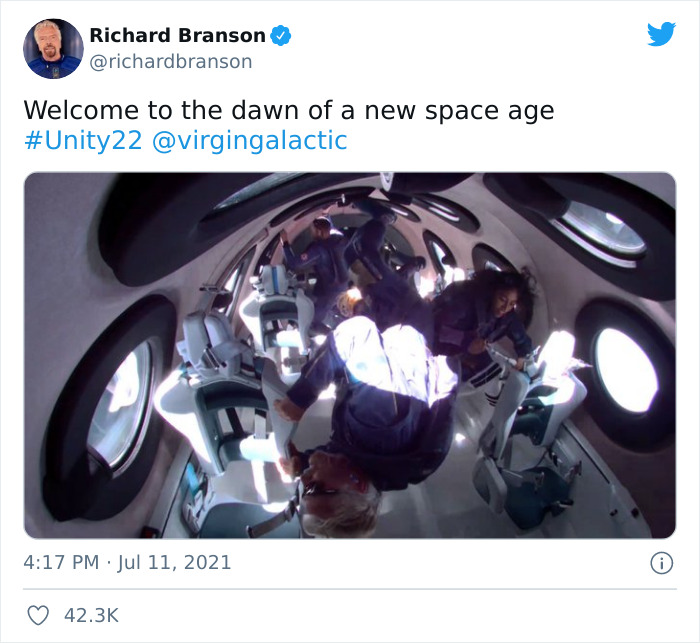 Load More Replies...I don't really have a problem with rich people spending money on extravagant things, provided they're also doing good things for humanity with their money. And maybe Branson, Musk, and Bezos are doing plenty of good things with their money. But if they are, why isn't the media more focused on reporting about that? Why did we have to endure hours of live coverage of that "edge of space" flight that overshadowed all other world news, as newscasters gushed completely uncritically about what an amazing achievement it was? It was practically an advertisement for Virgin Galactic.