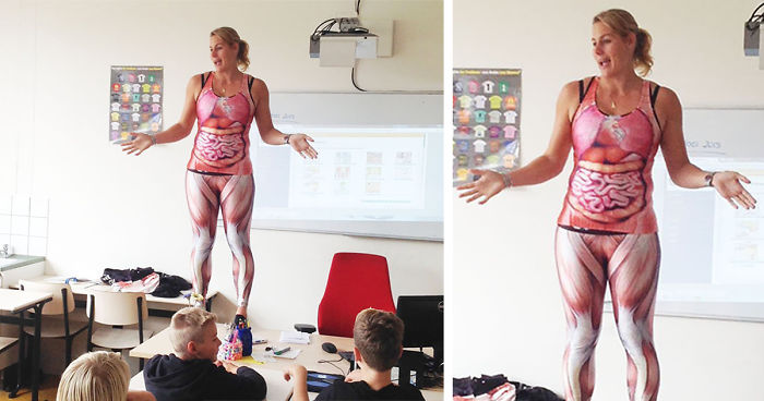 Debby Heerkens, a biology teacher at the Groene Hart Rijnwoude school in the Netherlands, came up with a truly memorable way to educate her students. She stood up on her desk and stripped off her clothes to reveal a full suit of spandex illustrated with accurate muscles and organs. Below that, another set of spandex illustrated where all the bones in her body are.