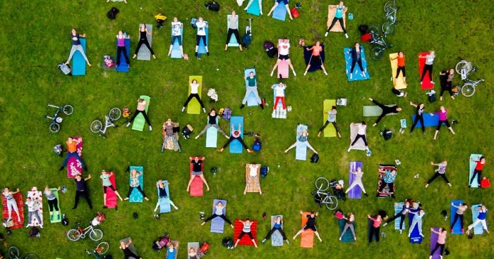 On a sunny day, I decided to go to Vilnius city central park to shoot some drone photos. When arrived, I saw a mass of people doing yoga with those colorful rugs. I lifted up the drone asap feeling a rush of adrenaline. People have been changing poses and staying still for a moment, which was perfect for some aerial view shots.