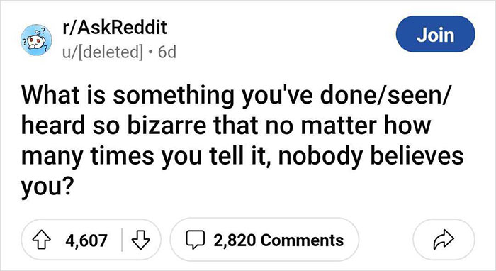 Well, this is the Internet, so even the most jaded crazy-story-havers can share their experiences. That's why when a netizen asked, "What is something you've done/seen/heard so bizarre that no matter how many times you tell it, nobody believes you?", over four thousand people came to reply. Do you have a relatively implausible story to share? Let us know in the comments!