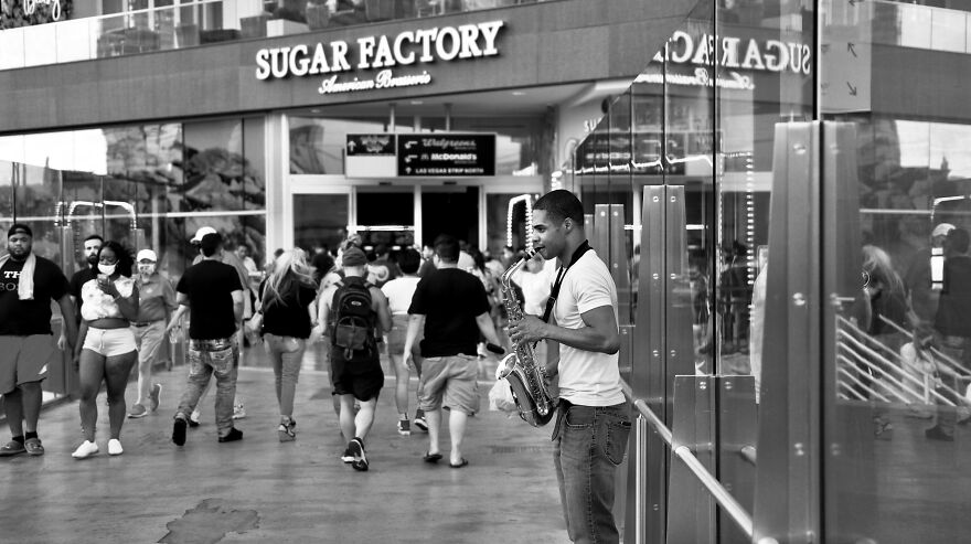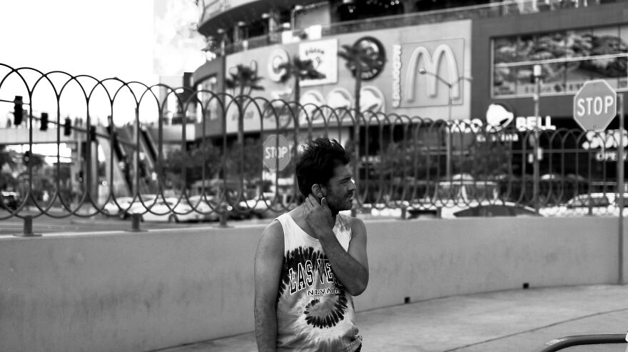 As a big fan of capturing street life, I didn’t want to go to Vegas to enjoy the big name shows and glitz but to see the dark reality of the “Haves and Have Nots.” There’s a desperation in everyone. The tourists wanting to strike it rich at the casinos, the hustlers making money off of them, and the destitute looking for scraps.
