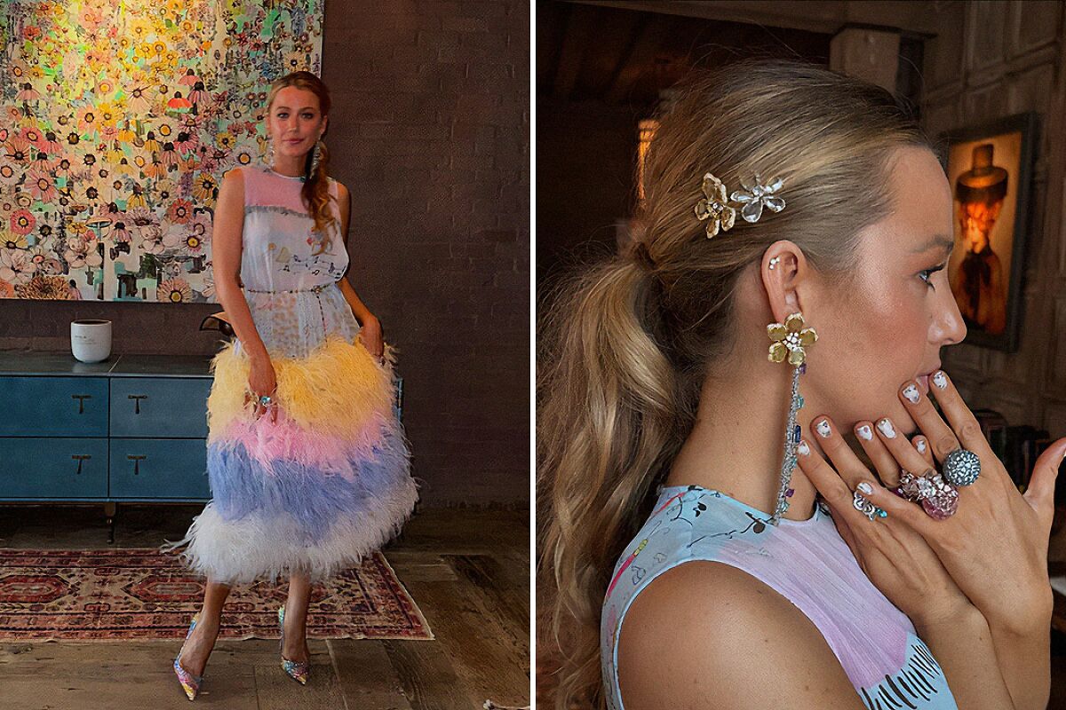 In another set of pictures, the fashionista posed in a feathery Dauphinette gown, which she wore to promote It Ends With Us. Blake captioned the post, “It’s not ever lost on me that I get to play dress up for a living.”