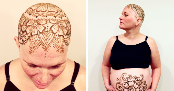 My name is Lynn Hetherington Becker and I am an artist in Columbus, OH. A couple of months ago I made a Facebook post offering to do free henna on chemo patients that have lost their hair. On Sunday I did my first henna crown session on a beautiful woman named Anne. Anne has such a beautiful spirit and she is so incredibly strong. She is currently pregnant, and found out she had breast cancer when she was only 17 weeks along. She had to endure a mastectomy and chemo during her pregnancy. She’s now 36 weeks. Chemo will resume after the baby girl is born. Her and the baby are both doing well. We decided to do belly henna too- I’ve painted many baby bumps but this was my first henna belly as well. Please keep them both in your thoughts and prayers. Anne has had a huge battle and it’s not over.