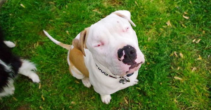 Meet Bear – a 1-year-old pit bull that went blind after being hit by a car. He was just walking around when suddenly a car hit him… The driver took off. Bear was injured and left alone. Thankfully, someone who saw the accident called the hospital. They brought the pup in with one blood shot eye, while the other was completely demolished. He looked horrible. Bear’s owner couldn’t afford surgery and abandoned him. He ended up sitting in a cage for 3 days. Luckily, Katie Frame’s mother worked at the hospital and the two of them decided to save Bear and take him home.