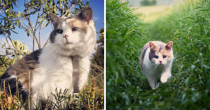 Stevie is a blind cat I adopted four years ago from a local animal shelter in Cork, Ireland. She’s a natural explorer and loves to accompany me on hiking trails in the beautiful Irish countryside and the surrounding mountains. When we go hiking together, my adorable cat usually prefers to explore all by herself and follows my sounds. She also walks alongside me on a leash or balances on my shoulders with ease!