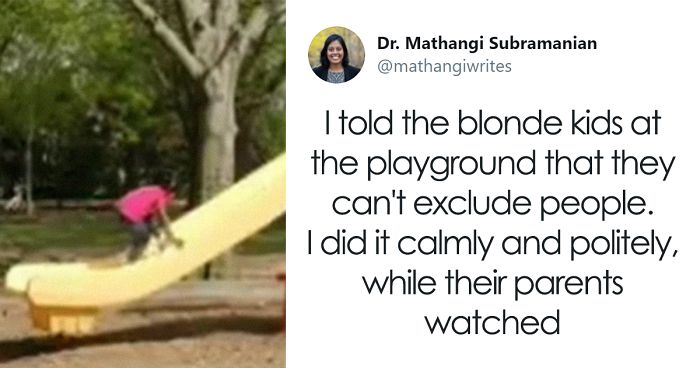 Dr. Subramanian said the exact words she told the blonde girls are a bit fuzzy now, but she explained to them that they weren’t allowed to exclude people in a public space like a playground. “I don’t know if they understood the message — I don’t think they did, because they didn’t actually let my daughter play with them,” the mother told Bored Panda.