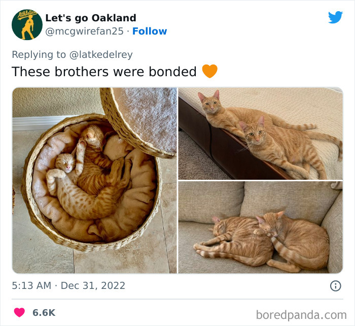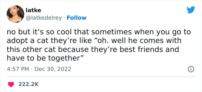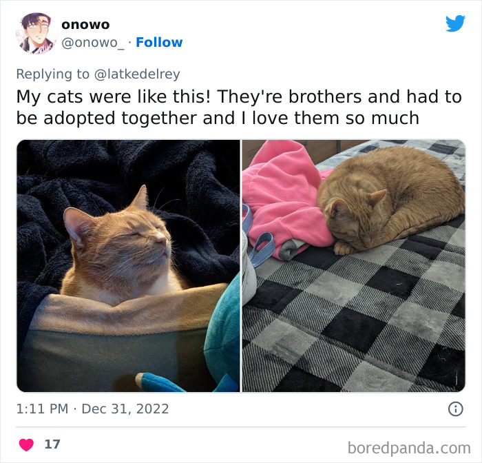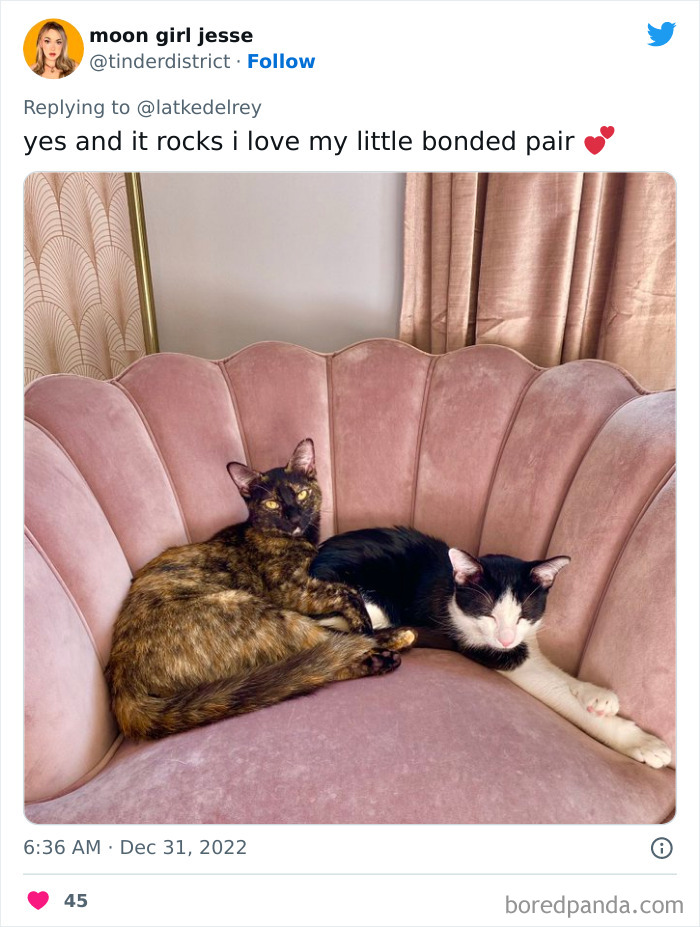 A now-viral tweet by @latkedelrey, with over 222k likes, brought up this very fact, and dozens of owners showed up to the thread, sharing pictures of their gorgeous bonded cats and the stories of their adoption. It quickly became one of the most wholesome places on Twitter, and we’re happy to share a handful of kitties with you all today.