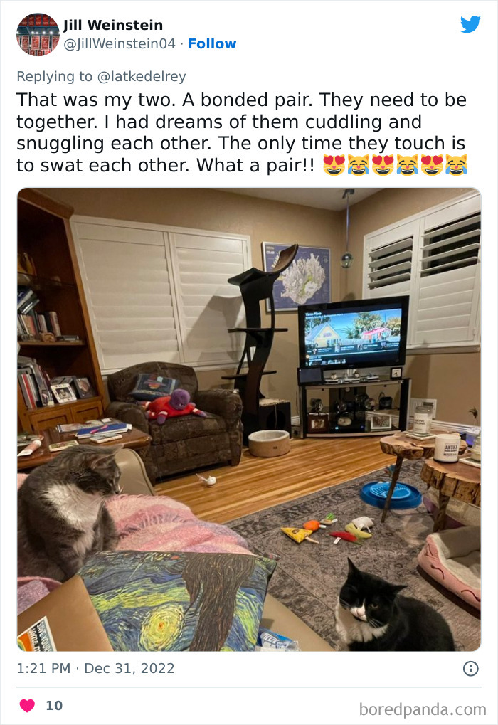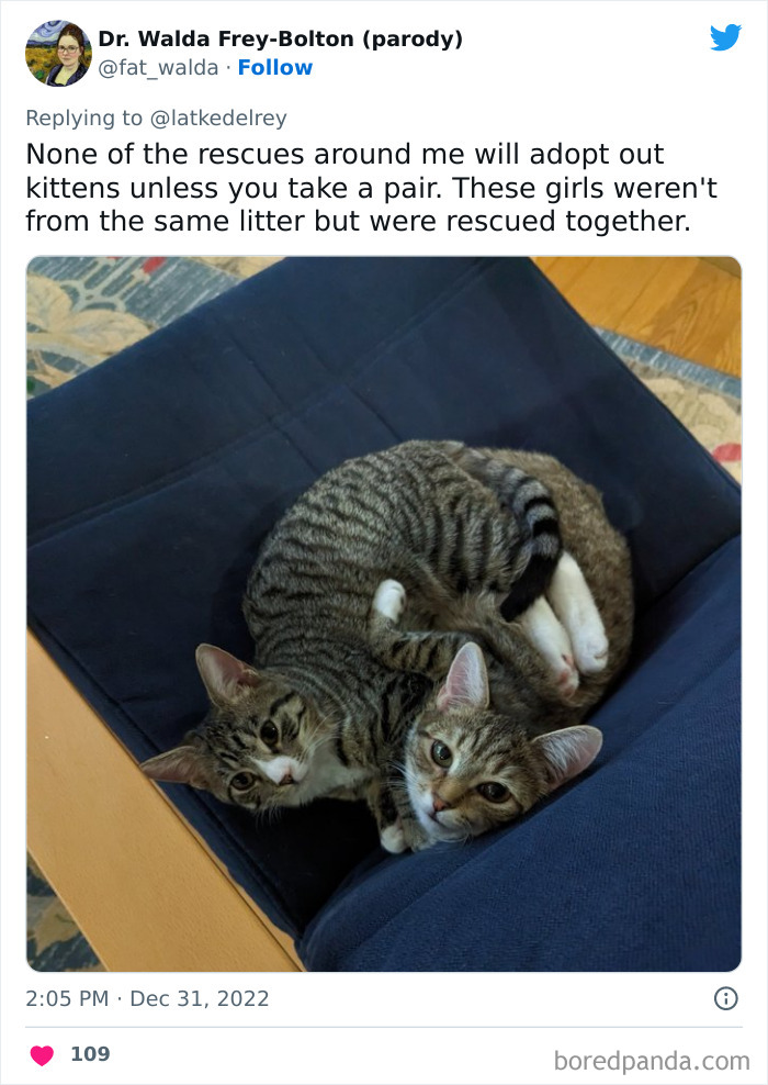 Some cats come as a bonded pair—they have a best friend or sibling that they got just a wee bit too attached to for whatever reason, and now it’d be utter cruelty to attempt to separate them. On one hand, it’s double the responsibility, but are you really going to sacrifice your cat’s happiness over some numbers? Doubt it. Now you’re the cat-human of two!