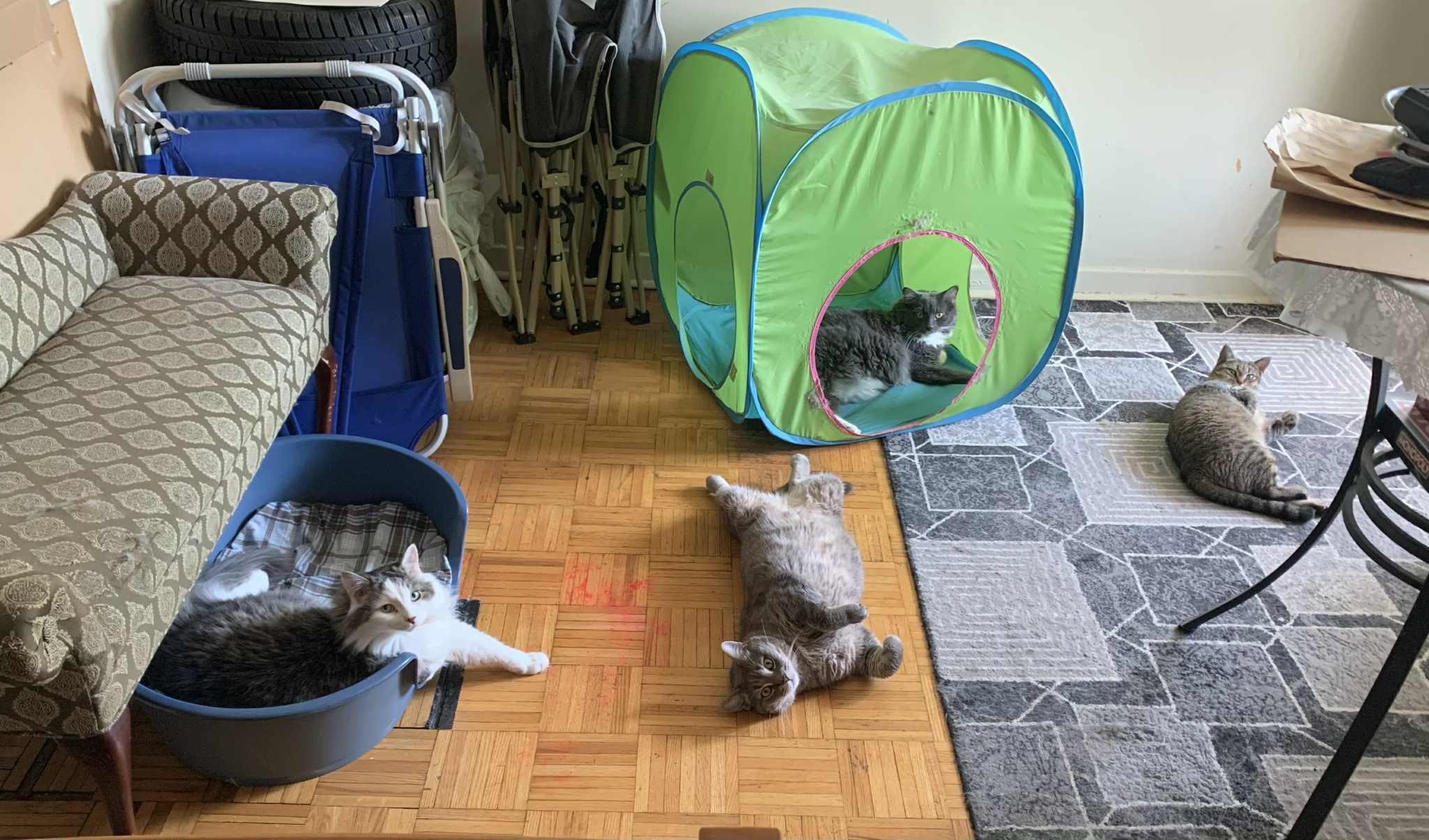 Echo (galaxy cat on the very corner), Finn (void cat) next to her, Emmet is under the blanket in the middle, my service dog Arizona on the top corner, and little 2-month-old Archie in the dog kennel apartment. I-need-a-b...ca7046.jpg
