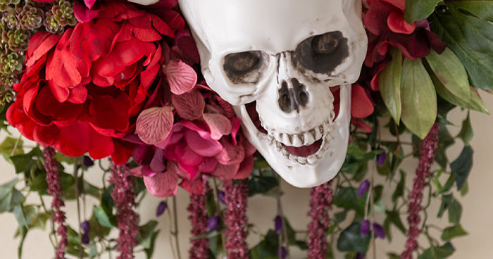 This Halloween decoration is pretty spooky. Using flowers and skulls, you can create a DIY Halloween decoration that is both delicate and scary.