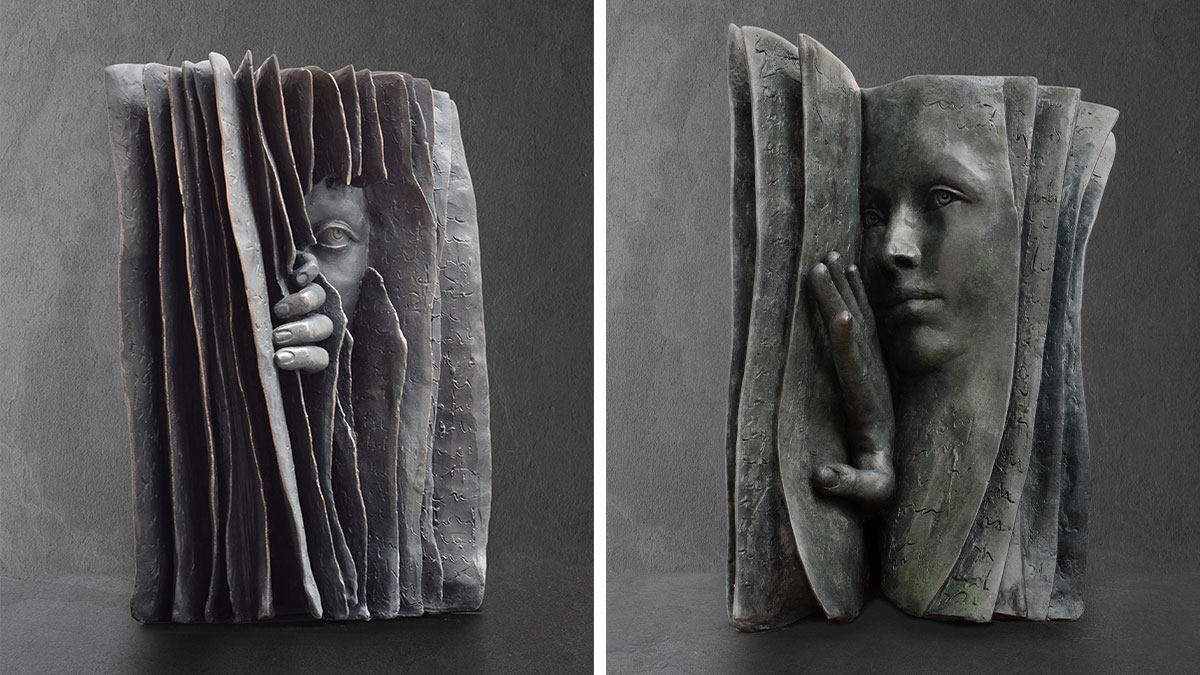 Italian artist Paola Grizi creates sculptures that feel as if they exist somewhere between literature, memory, and the human subconscious. Working primarily in bronze and terracotta, she transforms books, pages, and folded surfaces into haunting sculptural forms where faces, hands, and fragments of expression seem to emerge from within the material itself. Rather than treating the human face as a straightforward portrait, Grizi uses it almost like a revelation in progress, something half-hidden and half-born, caught between silence and self-discovery. Her pieces carry a strong emotional and symbolic charge, inviting viewers to look beyond the surface and into the inner tension of the work.