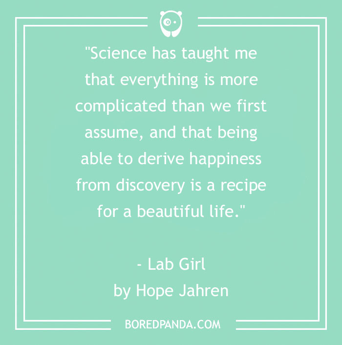 "Science has taught me that everything is more complicated than we first assume, and that being able to derive happiness from discovery is a recipe for a beautiful life." - Lab Girl by Hope Jahren