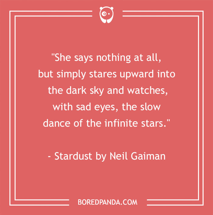 "She says nothing at all, but simply stares upward into the dark sky and watches, with sad eyes, the slow dance of the infinite stars." - Stardust by Neil Gaiman