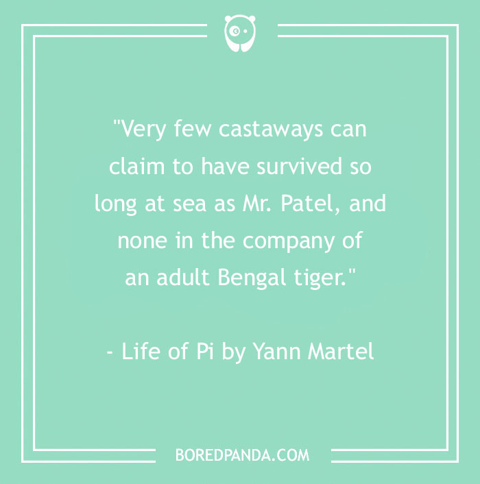 "Very few castaways can claim to have survived so long at sea as Mr. Patel, and none in the company of an adult Bengal tiger." - Life of Pi by Yann Martel