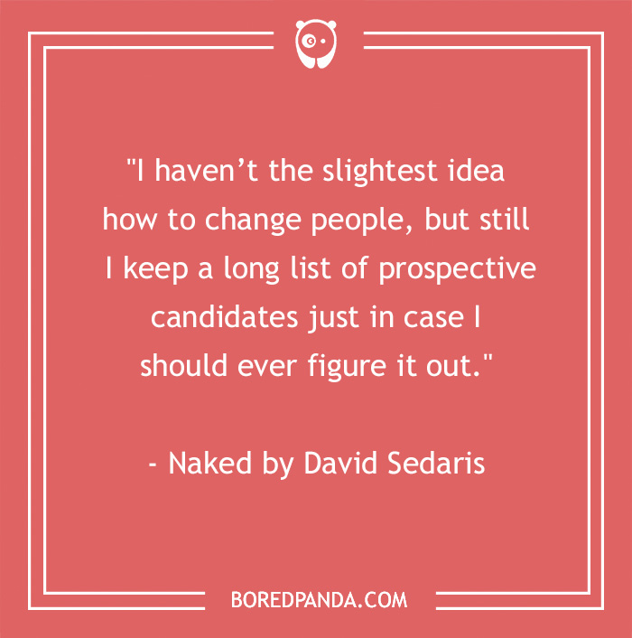 "I haven’t the slightest idea how to change people, but still I keep a long list of prospective candidates just in case I should ever figure it out." - Naked by David Sedaris