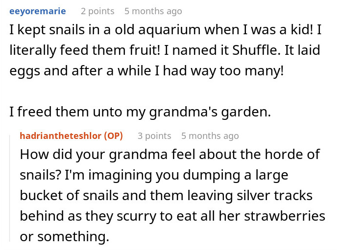 People also found the kid’s fascination quite adorable and shared some interesting snail facts in the comments for the 4-year-old.What about you? What are your thoughts about the story? Also, if you were in the poster’s shoes, how would you have handled the violent old man?