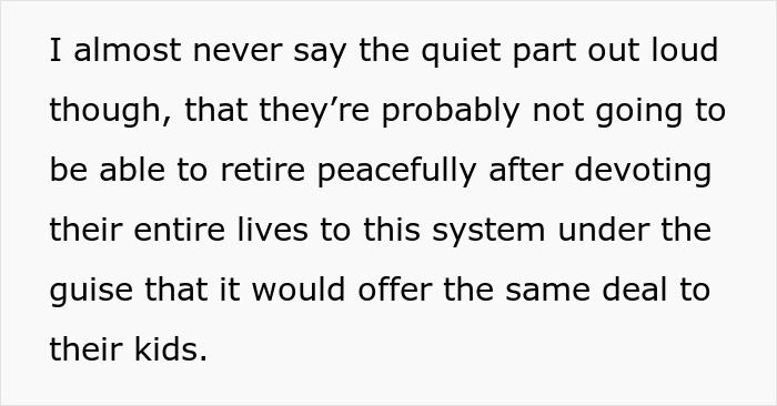 In the OP’s own words, they have talked to a lot of boomers and they “are clueless as to how hard younger generations have it, and how there’s no incentive to perpetuate the system.” The original poster wonders how the older generation can even retire peacefully after they’ve worked hard for this very system that now can’t provide the same deal to their own children and grandchildren.
