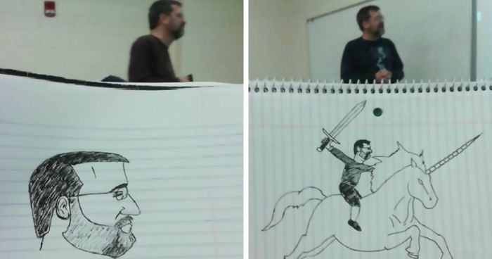 “This semester, I had business management taught by a painfully boring man that shall remain nameless,” the student writes. “Naturally, I sought ways to cure my boredom during this class. One day I decided to see how well I could draw him.” The student’s drawing was surprisingly good, so he decided to get a little more creative in the classes to come… From swinging on a wrecking ball to riding on a unicorn – the professor was drawn in all these hilariously creative sketches and more! Keep on scrolling to check them out.
