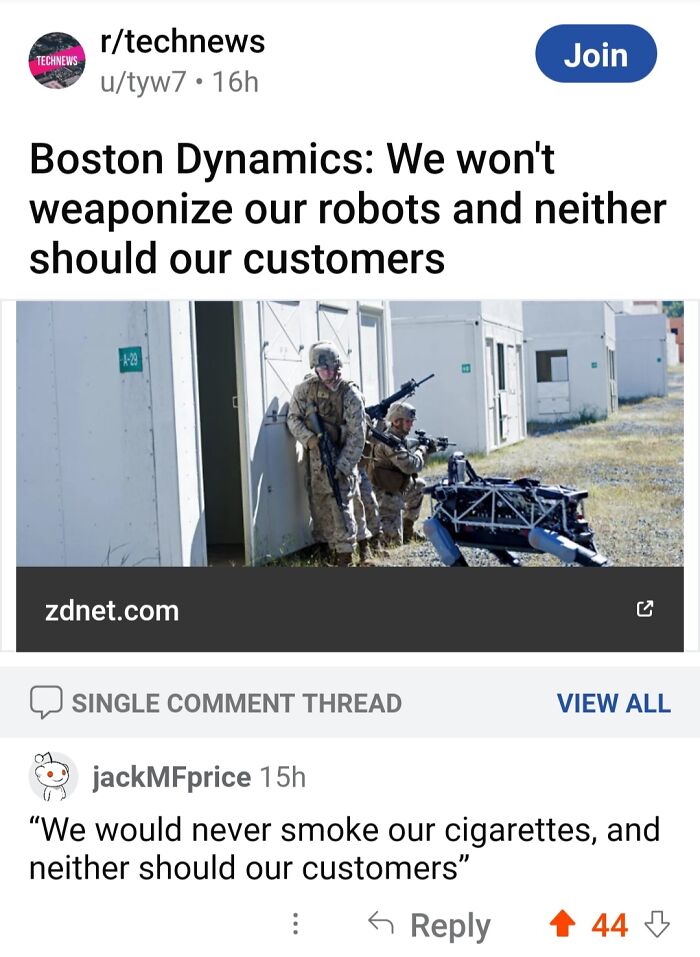 This is a bit of a grey area. Boston Dynamics robots do have a multitude of different uses that actually would benefit people greatly, in a healthier social and economic environment. It's a big oversimplification of a nuanced issue to compare them to cigarettes.