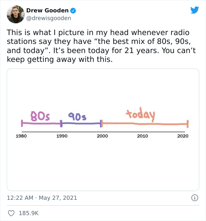 That timeline is correct. It applies to everything, not only music. I can vividly remember my life in the 80's and 90's but I have no clue of the last 20 years. Cannot distinguish last week from 15 years ago. It is one big puddle of time-mud.