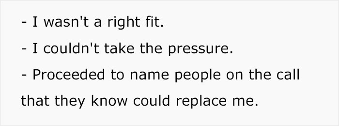 Load More Replies...I would've walked out after the first insult, but we don't know if she was depending on a PTO payout. Also, the rest of her coworkers should take it as a warning that this is no reflection on her but will be the way the people in management will treat them.