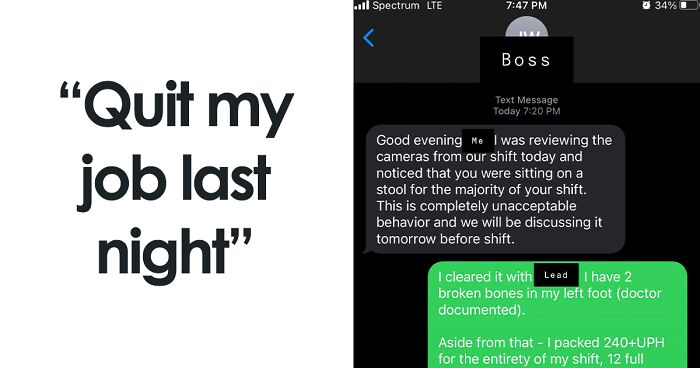 That’s exactly what redditor u/hestolemysmile proved when he shared how he quit his job after getting criticized by his boss for sitting on a stool… even though he had two broken bones in his foot. You’ll find the full text message exchange below, Pandas.