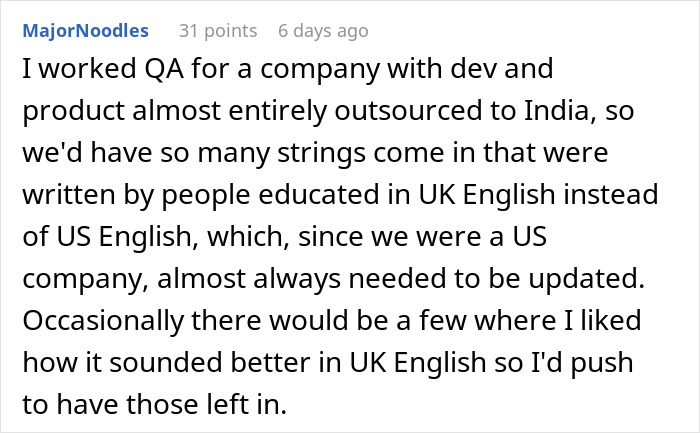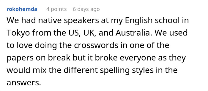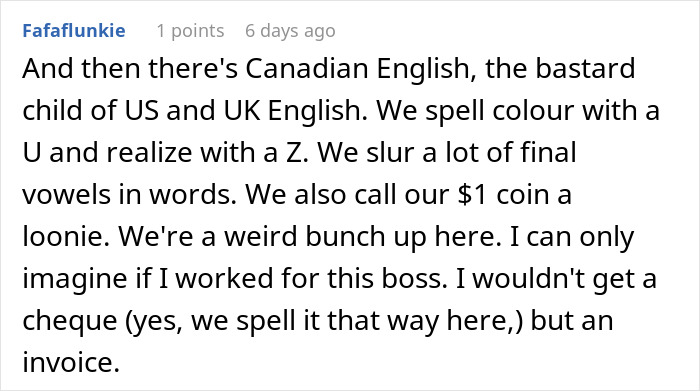 I would hope that the boss in this story learned his lesson, as the woman noted that he thankfully never docked her pay again. And while I’m certainly an advocate of learning proper grammar, I don’t think it’s fair to judge your employees or start messing with their paychecks when there have not been solid rules determining what type of grammar should be taught/spoken in class. We would love to hear your thoughts on this situation in the comments below, pandas. And let us know what dialect of English you speak. American, Canadian, British, Irish, Australian, or another style? Then if you’d like to check out another Bored Panda article featuring how silly linguistics can be, you can find that right here!