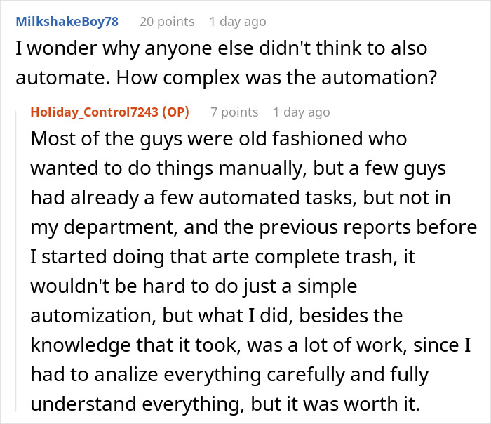 Load More Replies...What gets me is that he specifically states he automated his job. If he can automate it there are others that can as well. This would make him redundant in that role and they could just automate it. Companies have been this for years. This has to be a fake one again or should I say as usual