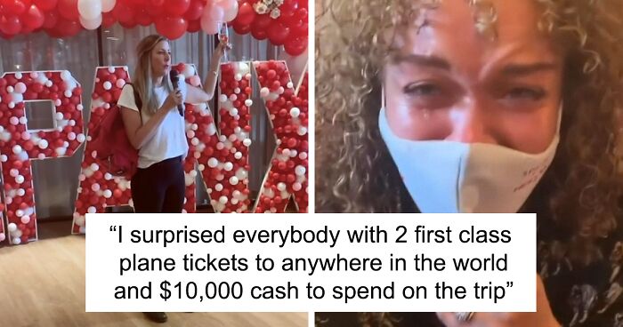 She also told the staff that each person would get two first-class plane tickets to anywhere in the world, plus $10,000 spending money
