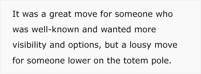 Load More Replies...I think the boss here could have been more on top of his game and let the guy know at the time that he was doing well and was popular. Not referencing what the woman was saying at all just in his periodic reviews and such at the time. That'd have given the guy some much-earned confidence that would likely have made him more able to ignore whatever s**t she was doing/saying. If someone is doing a good job then you tell them there and then, not wait until another problem is dealt with.