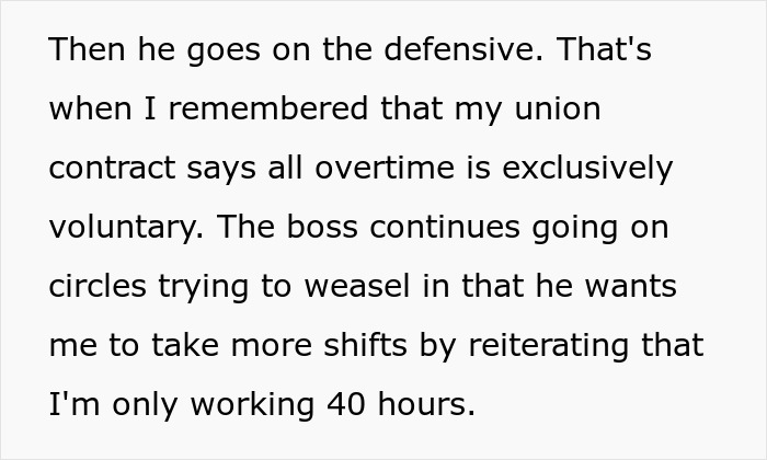 The redditor’s post got a lot of attention on the r/antiwork online community. The OP shared how his boss tried to tell him to volunteer for extra work without actually saying it aloud. You see, these extra shifts were volunteer-only. They pay well, however, you couldn’t actually force someone to pick them up.