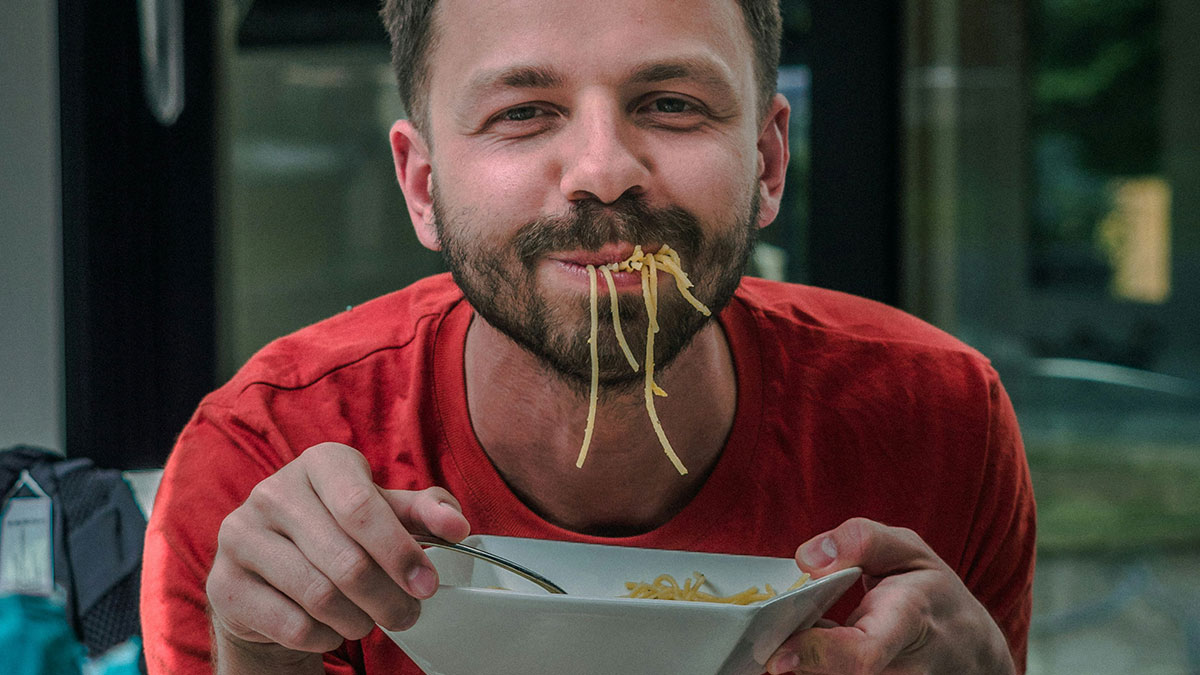 Man eating noodles during lunch break, reflecting the impact of boss demands and workplace sacrifices.