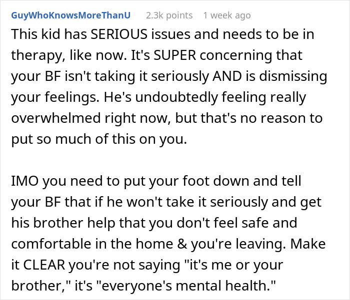 Load More Replies...Remember, older brother and younger brother have the same parents. No wonder older brother doesn’t see anything wrong with younger brother’s behavior. The priority is for OP to get TF out of there and find some place safe to stay. Second, she needs to tell her BF that younger bro’s behavior is NOT normal, is making you feel unsafe, and therefore is the reason you are leaving. She needs to tell him HE needs to get his brother into intensive therapy or he will grow into a truly f****d up adult, in and out of jail just like mom and dad. And yes, we’re missing a s**t ton of context here that could clarify why little bro is such a creep. But that is little bro’s FAMILY’S problem to fix, NOT OP’s. She needs to rethink whether this relationship is even going to continue, because she is not safe in it, and her BF is not protecting her at all.